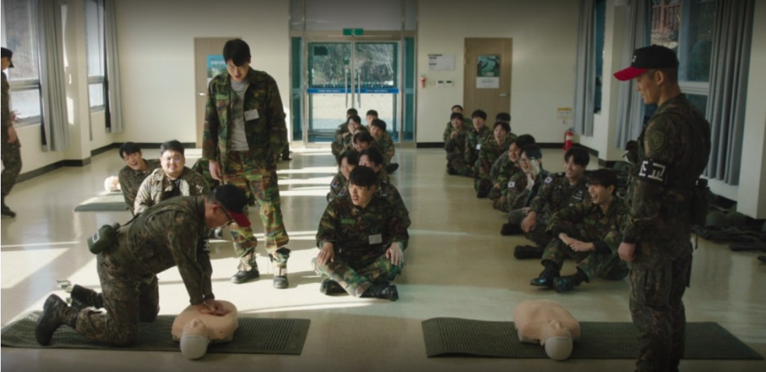 "잘한다, 조교!"라는 예비군들의 장난 섞인 환호에 이번에도 박민석은 신이 납니다. 칭찬만 들으면, 이성을 잃고 마는 박민석이네요. 결국 과장된 시연으로 박민석의 CPR 시연은 점점 트월킹처럼 변해가며 모두를 폭소하게 만듭니다.